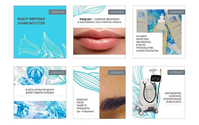 2) Наполнили сообщества регулярно публикуемым контентом. Работ до/после - основного двигателя рекламы косметологических услуг - из-за недавнего открытия было очень мало. Поэтому основной упор в контенте на первом этапе сделали на возможности оборудования и профессионализм врачей.